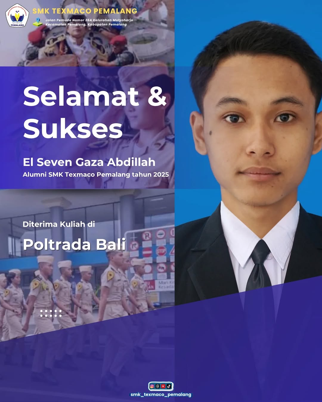 Selamat kepada alumni SMK TEXMACO PEMALANG tahun 2025 sudah diterima di Politeknik Transportasi Darat (Poltrada) Bali.